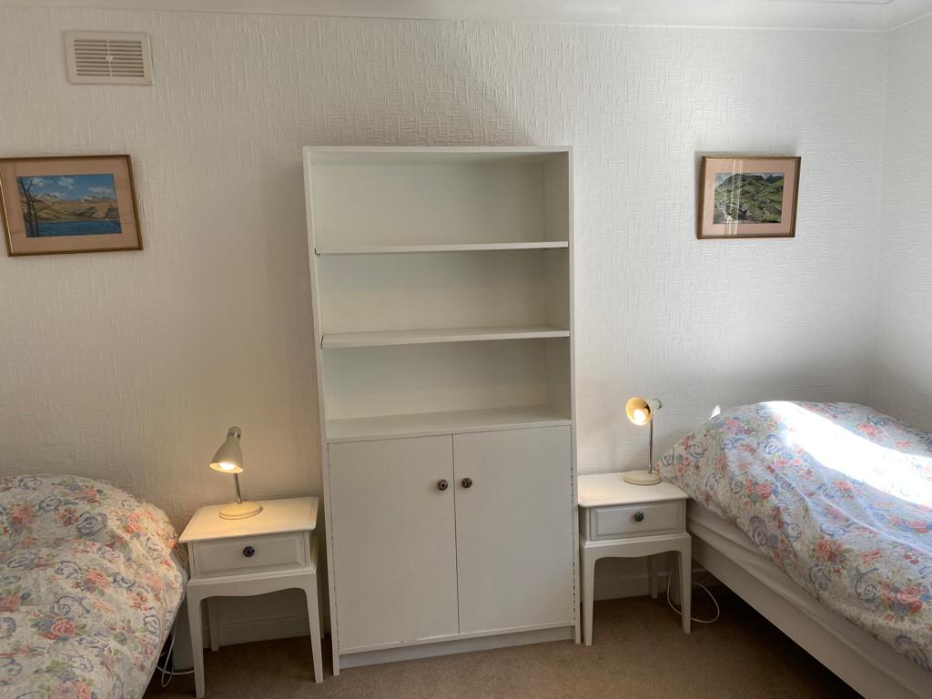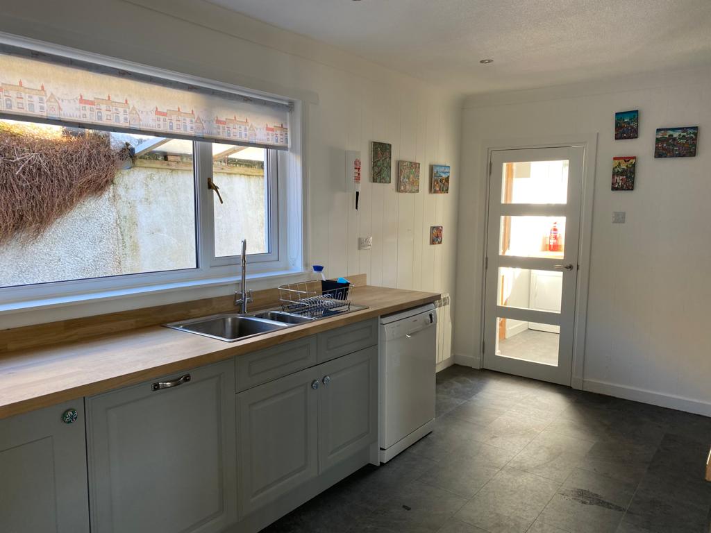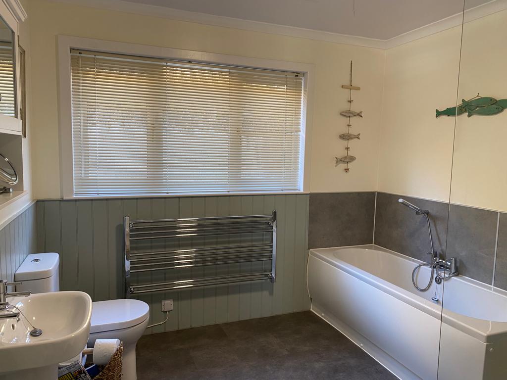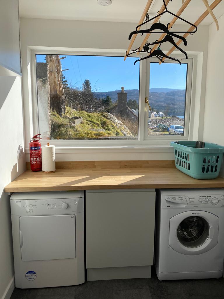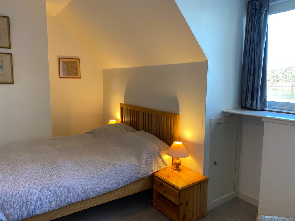 There is also a well equipped kitchen, adjacent utility room with washing machine and drier, spacious bathroom with WC, wash hand basin and bath with seperate shower; double bedroom with views over loch, and a twin bedroom at the rear.